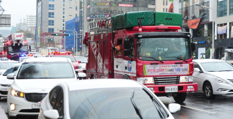 소방차가 일반 차량들을 사이로 지나가고 있다. 사진과 기사는 관련 없음. /뉴스1 |