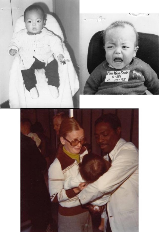 처음 두 장의 사진은 서울에 있는 입양기관 홀트에서 찍은 것입니다. 사진 중 한장에서 나는 울고 있습니다. 다른 사진에서 나는 울지 않지만 행복해 보이지도 않습니다. 내가 갖고 있는 다음 사진은 덴마크의 코펜하겐 공항에서 낯선 사람 (홀리스 씨)이 나를 (양)어머니에게 넘겨주는 사진입니다. 그녀는 매우 행복해 보입니다. 그때 나는 생후 19개월로 추정됩니다.