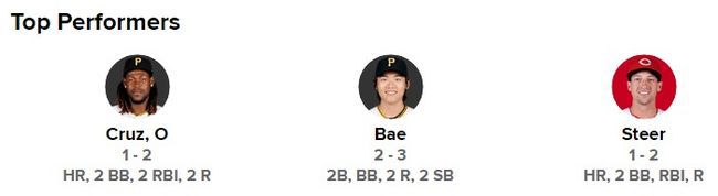 mlb.com은 개막전에서 가장 뛰어난 활약을 펼친 ‘Top Performers’ 3명을 꼽았다. 홈런을 친 크루즈와 스티어, 그리고 ‘만만한 8번타자’ 배지환이었다.
