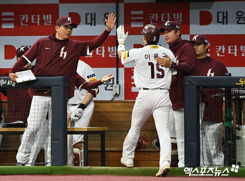 (엑스포츠뉴스 고척, 김한준 기자) 1일 오후 서울 구로구 고척스카이돔에서 열린 ’2023 신한은행 SOL KBO리그’ 한화 이글스와 키움 히어로즈의 개막전 경기, 3회말 2사 1,2루 키움 이용규가 러셀의 2타점 2루타때 득점에 성공한 후 홍원기 감독과 하이파이브를 하고 있다.