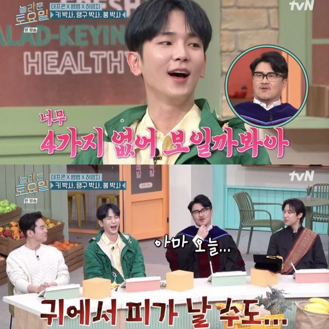 이날 데프콘은 ‘놀토’ 멤버 중 감싸주고 싶은 멤버가 있다며 키를 언급했다. 그는 “지난 출연 때 키 옆에 앉았는데 나중에 방송을 봤는데 키가 너무 예민하더라”라고 떠올렸다. 당시 데프콘 옆에 앉았던 키는 계속되는 어깨 터치와 끊임없는 수다로 힘들었던 상황.