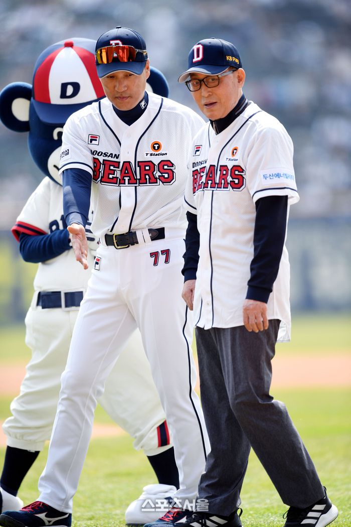 두산 이승엽 감독이 1일 잠실야구장에서 열린 2023 KBO리그 롯데와 경기 전 시구자 전 김인식 감독을 시구자리로 모시고 있다.