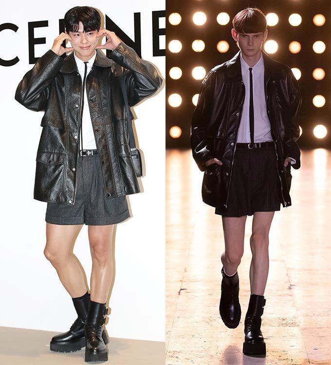 박보검은 가죽 재킷과 셔츠, 반바지, 타이와 워커까지 런웨이 모델 룩을 완벽히 소화했다. 박보검은 워커 위로 살짝 드러나는 검은색 양말을 신은 반면 모델은 흰 양말을 신었다.