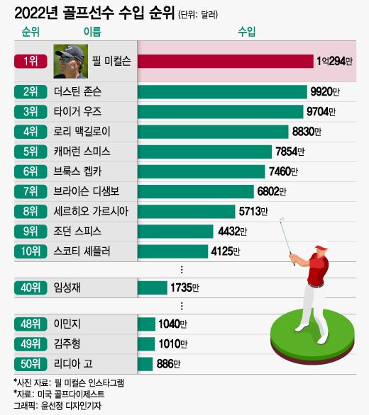 가장 높은 수입을 기록한 선수는 필 미컬슨이었다. 그는 1억294만달러(약 1339억원)를 벌면서 이 부문 1위에 올랐다. 특히 그는 LIV 계약금 등 경기 외적으로 1억100만달러를 번 것으로 알려졌다. 다만 그는 LIV 골프 멤버이기에 PGA로 돌아가려면 최대 4억달러의 거액을 반환해야 한다.