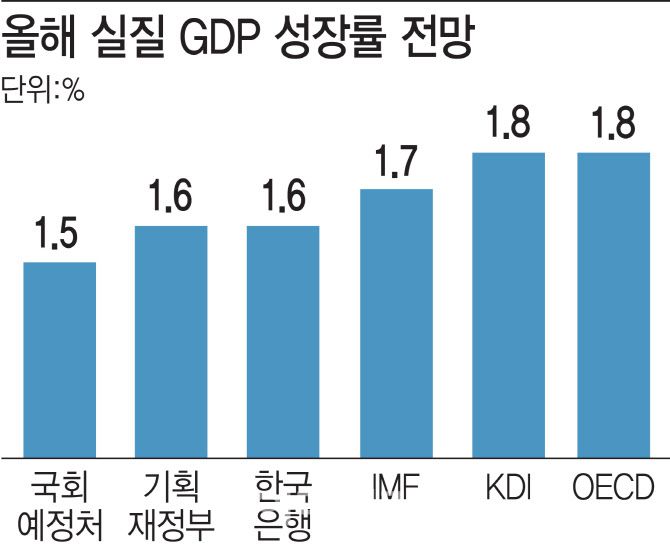 예정처는 올해 실질 국내총생산(GDP) 성장률을 1.5%로, 지난해 10월 전망치(2.1%) 대비 0.6%포인트 하향했다. 이는 기획재정부(1.6%), 한국은행(1.6%), 한국개발연구원(KDI·1.8%)보다 0.1% 이상 낮다. 국제통화기금(IMF·1.7%), 경제협력개발기구(OECD·1.8%) 전망치 대비로도 0.2~0.3%포인트 낮다.