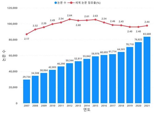 (서울=연합뉴스) 조승한 기자 = 한국이 2021년 과학기술인용색인(SCI) 발표 논문 수 순위에서 전 세계 12위를 기록했다. 세계 논문 점유율은 2.4%로 2016년 이후 처음 반등한 것으로 나타났다.