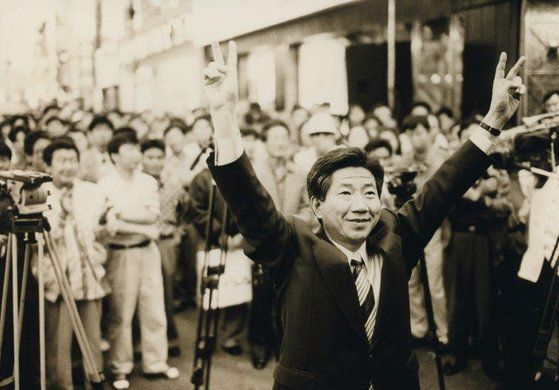 1995년 6월 제1회 전국동시지방선거에서 부산시장 선거에 출마한 노무현 전 대통령이 유권자들에게 둘러싸인 채 양손을 들어올려 승리의 브이자를 만들어 보이고 있다. 노무현 사료관 홈페이지