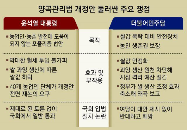 尹 “양곡법, 농민에 도움 안돼”… 野 “농민 생존 외면” 재표결 방침
