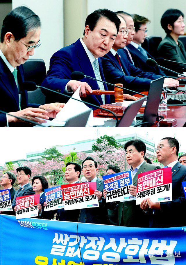 대통령실·여당과 야당은 4일 윤 대통령이 양곡관리법 개정안에 대해 거부권(재의요구권)을 행사한 것을 두고 거세게 맞붙었다. 윤 대통령은 “농업인과 농촌 발전에 전혀 도움이 되지 않는 포퓰리즘 법안”이라고 강도 높게 비판했다. 민주당은 “대통령이 절박한 농심을 매몰차게 거부하고 농민 생존권을 볼모로 삼았다”고 맹폭했다. 국민의힘은 “거야(巨野)의 위헌적 입법 폭주에 따른 농가파탄법에 대해 대통령의 헌법상 권한을 발동한 것”이라며 “민주당은 노무현 전 대통령도 (재임 당시) 6차례 거부권을 행사했다는 사실을 되돌아봐야 한다”고 맞받았다.