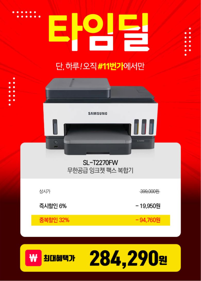 삼성전자, 정품무한 잉크젯복합기 SL-T2270FW 11번가 타임딜 4월 7일(금) 하루 특가