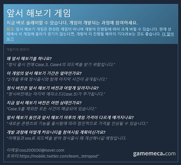 나이로 개발자는 “일단 예상보다 많은 분들이 관심을 가져주셔서 놀랍고 감사드린다. 아직 첫 작품이다 보니 부족한 부분도 많은데, 좋은 부분을 잘 봐주시고 많이 해주신 덕분이다. 게임 개선은 정식 출시 이후로도 계속 이어나갈 예정”이라 밝히며, “신생팀임에도 스테퍼 케이스라는 우리의 첫 걸음이 잘 떼어진 것 같아서 매우 기쁘다. 하지만 여기서 만족하거나 자만하지 않고 더 많은 게임을 만들고 싶다. 스테퍼 케이스에 대한 관심도 좋지만, 많은 분들이 팀 테트라포드에 대해서도 알아주셨으면 좋겠다”라고 스테퍼 케이스에 대한 관심을 밝혔다. 팀 테트라포드의 스테퍼 케이스는 오는 30일 정식 출시된다.