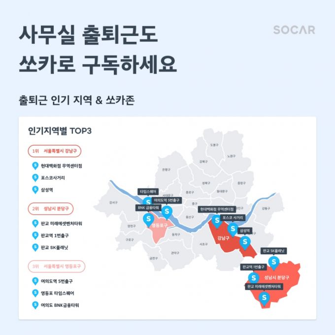 퇴출근패스 구독자들이 가장 많이 쏘카를 대여한 곳은 서울 강남구로, 전체 13%를 차지했다. 강남구에서 퇴출근패스를 가장 많이 이용하는 쏘카존은 현대백화점 무역센터점으로, 포스코사거리와 삼성역이 그 뒤를 이었다.