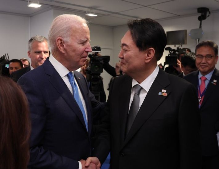 조 바이든 미국 대통령이 지난해 7월 스페인 마드리드 이페마(IFEMA) 컨벤션센터에서 열린 한미일 정상회담에 앞서 윤석열 대통령을 영접한 모습. 대통령실 제공