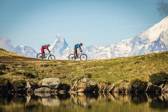 자전거 여행객이 마터호른 설산을 배경으로 한 알프스 자락 호숫가를 지나고 있다. 스위스관광청 제공 |