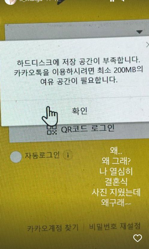 사진 속 하드 디스크 저장 공간이 부족하다는 경고문이 담겼다.