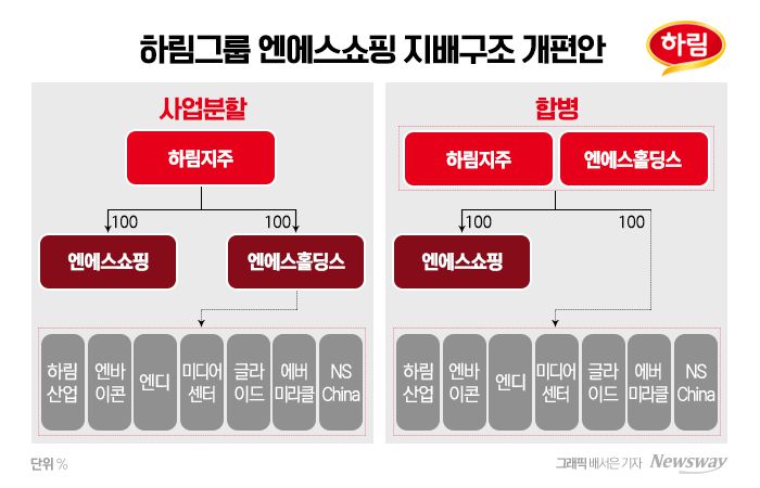 이렇게 되면 '하림지주-엔에스쇼핑'으로 이어지던 지배구조가 '하림지주-엔에스홀딩스-엔에스쇼핑'으로 바뀐다. 하림지주는 엔에스홀딩스를 다시 합병해 '하림지주-엔에스쇼핑'의 지배구조를 만들 계획을 세웠다.