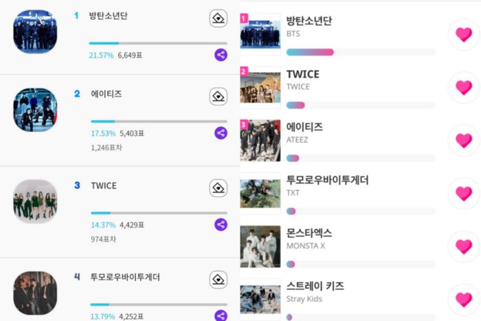 나머지 1개 팬덤 플랫폼에서는 1위였던 세븐틴을 제치고 K팝 신흥강자 투모로우바이투게더가 다시 정상의 자리에 올랐고, 근소한 차이로 세븐틴이 2위를 차지하며 1위를 바짝 뒤쫓고 있다.