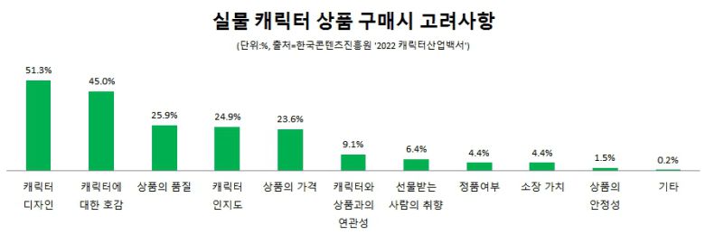 실제 한국콘텐츠진흥원의 ‘2022 캐릭터 산업백서’에 따르면 최근 1년간 캐릭터 상품 이용 행태에 대한 질문에서 응답자의 86%가 ‘실물 캐릭터 상품 구매 경험이 있다’고 했다. 실물 캐릭터 상품 구매 시 고려사항에는 캐릭터디자인(51.3%)와 캐릭터에 대한 호감(45.0%)이 상품의 품질(25.9%)보다 우선시되며 품질보다는 캐릭터가 더 크게 영향을 미친 것으로 나타났다.