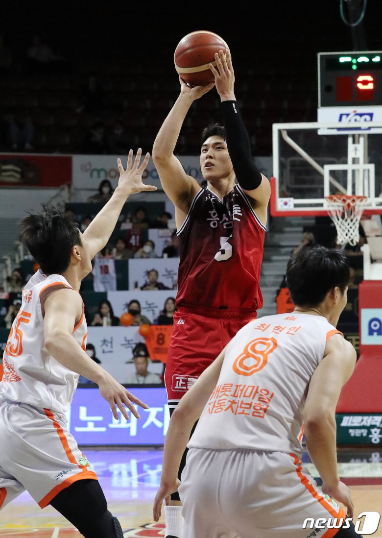 (안양=뉴스1) 박세연 기자 = 13일 경기도 안양실내체육관에서 열린 2022-2023 KBL 프로농구 4강 플레이오프 1차전 안양 KGC와 고양 캐롯과의 경기에서 변준형(KGC)이 미들슛을 하고 있다. 2023.4.13/뉴스1