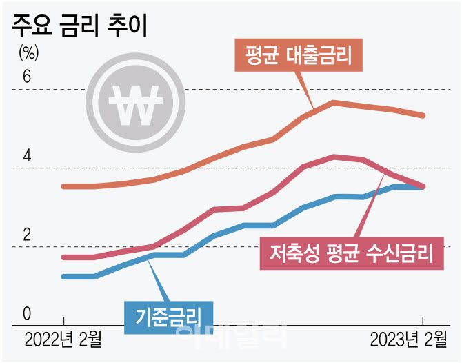 한국은행에 따르면 은행의 평균 대출금리는 신규취급액 기준 지난해 11월 5.64%를 기록한 후 12월 5.56%, 올해 1월 5.46%, 2월 5.32%로 3개월 연속 내렸다. 최저 대출금리는 3%대다. 저축성 수신 평균금리도 지난해 11월 4.29%에서 올해 2월 3.54%로 3개월째 하락했다.