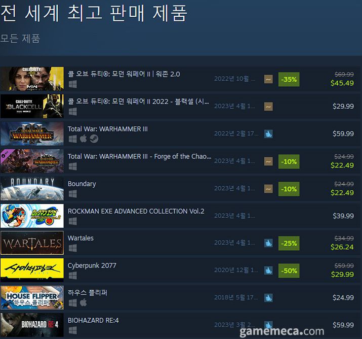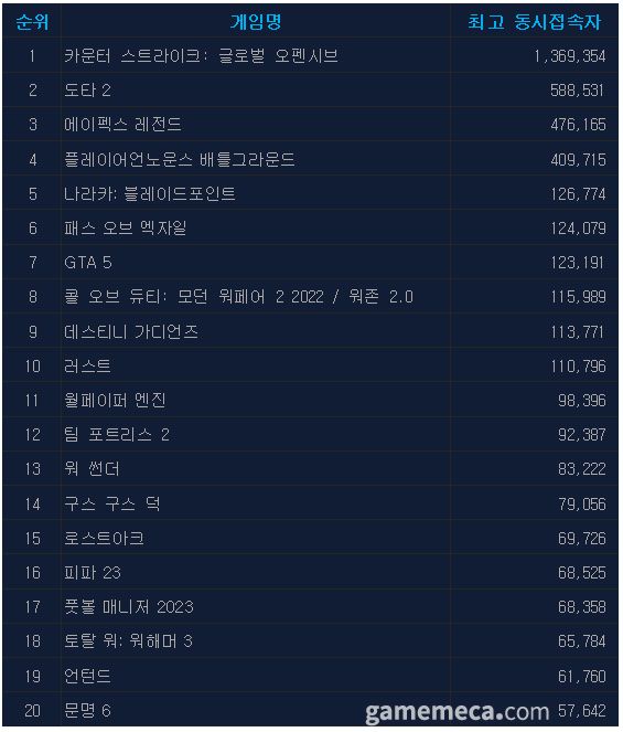 일 최고 동시접속자 TOP 20에서는 콜 오브 듀티: 모던 워페어 2 2022가 동시접속자 수 11만 5,989명으로 8위로 상승했다. DLC를 출시한 토탈 워: 워해머 3 또한 6만 5,784명을 기록하며 18위에 올랐다.