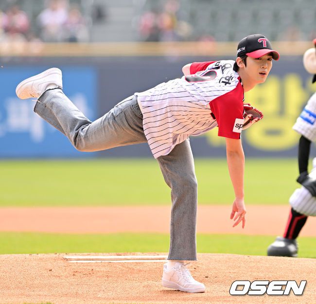 그룹 위아이 김요한이 시구자로 나서 힘차게 공을 던지고 있다. 2023.04.16 / dreamer@osen.co.kr