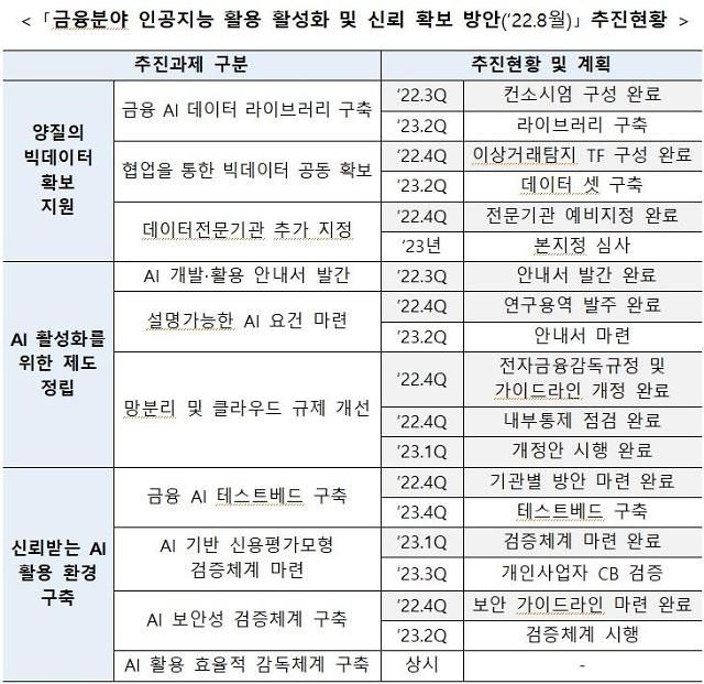 금융위는 지난 2022년 8월 발표한 '금융분야 인공지능 활용 활성화·신뢰확보 방안'의 후속조치를 17일 공개했다. 금융권에서 신뢰받는 AI 활용 환경을 구축할 수 있도록 'AI 기반 신용평가모형 검증체계'와 '금융분야 AI 보안 가이드라인'을 마련했다.