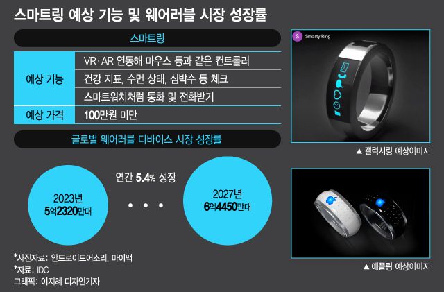 한편 스마트링 출시로 글로벌 웨어러블 시장 성장세는 더욱 가팔라질 전망이다. 시장조사업체 IDC에 따르면 올해 웨어러블 기기 출하량은 전년 대비 6.3% 증가한 5억2320만대로 예측됐다. 향후 5년간 연평균 5.4%씩 성장해 2027년에는 6억4450만대의 출하량이 예상된다고 IDC는 분석했다.