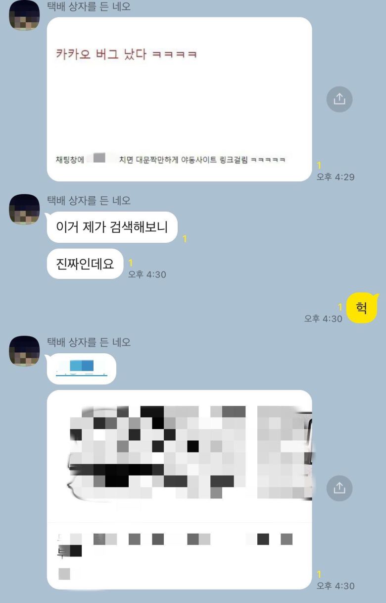 앞서 이날 복수의 인터넷 커뮤니티에는 ‘카카오 버그 났다’ ‘카톡 버그 떴네’ ‘현재 카톡 버그’ 등 제목의 게시물이 올라왔다. 모두 카카오톡 채팅창에 특정 단어를 입력하면 음란물 사이트가 링크된다는 내용이다. 일부 게시물은 약 6시간 전인 오전 11시즈음에 올라왔다.
