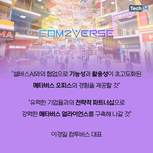 컴투버스는 이번 협약을 바탕으로 셀바스AI와 함께 메타버스 인프라스트럭처로 설계되는 컴투버스를 위해, 인공지능 기술 및 서비스 개발에 대한 전략적 협력을 추진할 계획이다. 또한 셀바스AI와 2분기 첫 선을 보이는 컴투버스의 오피스 서비스 경쟁력을 더욱 강화하기 위한 오피스 솔루션 구축을 위해 힘을 모은다.