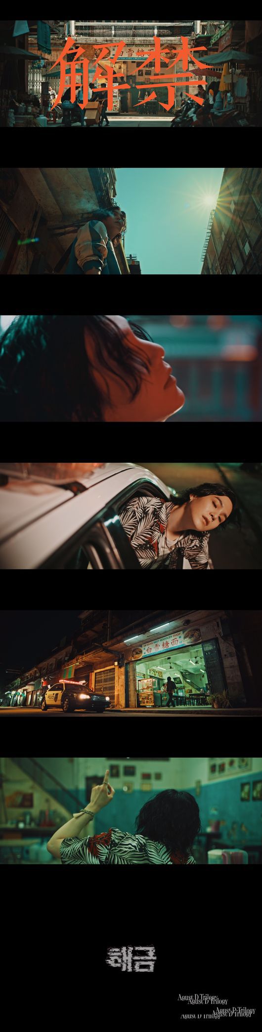 이날 공개된 '해금'의 뮤직비디오는 전반적으로 한 편의 누아르 영화 같은 분위기 속에 짜임새 있는 스토리 라인과 긴장감 넘치는 극적 요소가 돋보인다. 특히, 닮은 듯 다른 분위기의 두 인물을 1인 2역으로 오가는 슈가의 열연이 압권이다. 앞서 콘셉트 포토에 나왔던 상반된 캐릭터 'Being'과 'Exister'의 대결, 그리고 극적 반전이 시선을 붙잡는다.