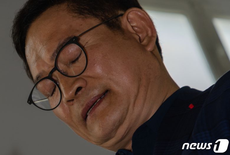송영길 전 더불어민주당 대표가 22일 오후(현지 시간) 프랑스 파리의 한 교민 사무실에서 열린 특파원 간담회에서 ’2021년 전당대회 돈 봉투 의혹’과 관련해 공식 입장을 밝히던 중 만감이 교차하는 듯 잠시 눈을 감고 있다. 이번 사태의 모든 정치적 책임을 지고 민주당 탈당과 함께 즉시 귀국해 검찰 조사를 받을 계획이라는 송 전 대표는 24일 오후 아시아나 항공편으로 인천공항을 통해 귀국 할 예정이다.  ⓒ News1 이준성 기자
