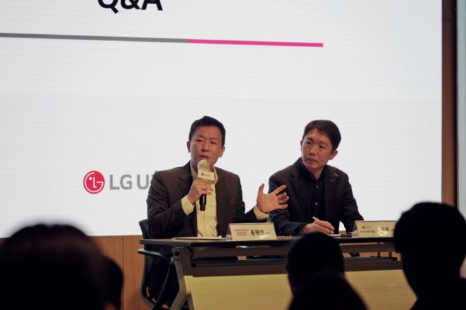 홍원빈 포항공대 교수(왼쪽)와 조제훈 LG유플러스 네트워크부문 엑세스선행기술개발팀장이 24일 서울 용산사옥에서 열린 기자간담회에서 RIS에 대해 설명하고 있다. /사진=LG유플러스 |