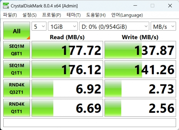 해당 마이크로 SD 카드를 'Sandisk IMAGEMATE PRO USB-C 카드리더기'에 연결 후 크리스탈 디스크 마크로 속도를 측정해보니 연속 읽기 속도 177.72MB/s, 연속 쓰기는 137.87MB/s로 확인됐다.