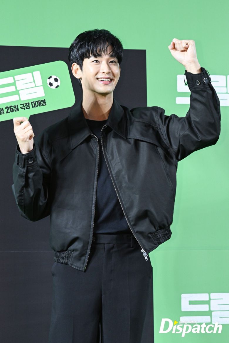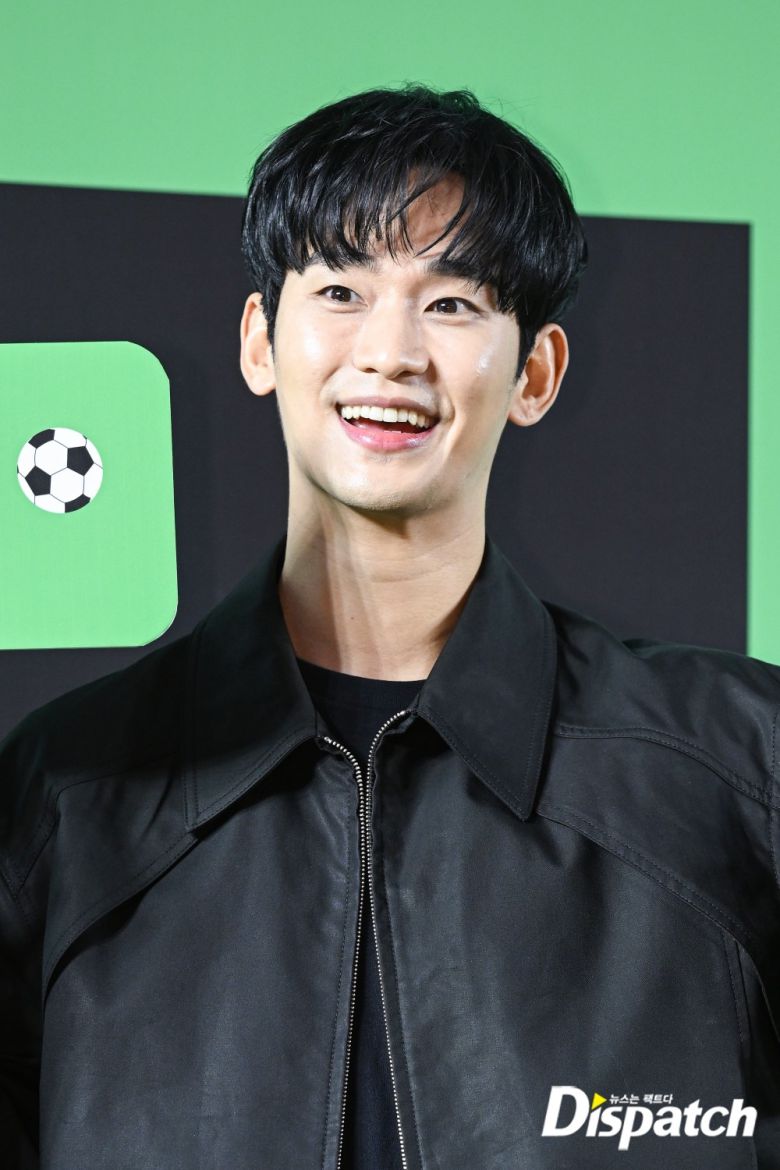 김수현은 블랙 블루종과 팬츠로 멋을 냈다. 밝은 미소가 시선을 사로잡았다.