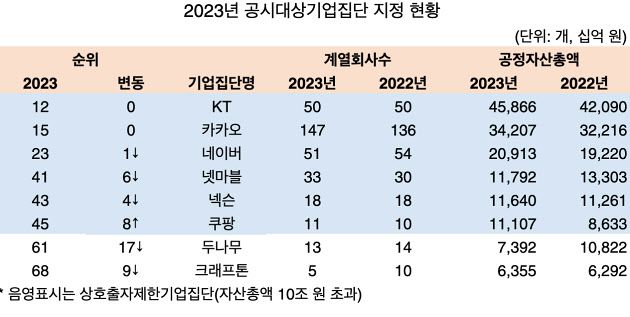 공정거래위원회가 지난 25일 공개한 ‘2023년도 공시대상기업집단 지정 현황’에 따르면 기업 자산 총액 5조원이 넘는 IT 대기업은 총 8곳으로 △KT(12위) △카카오(15위) △네이버(23위) △넷마블(41위) △넥슨(43위) △쿠팡(45위) △두나무(61위) △크래프톤(68위)이 이름을 올렸다.