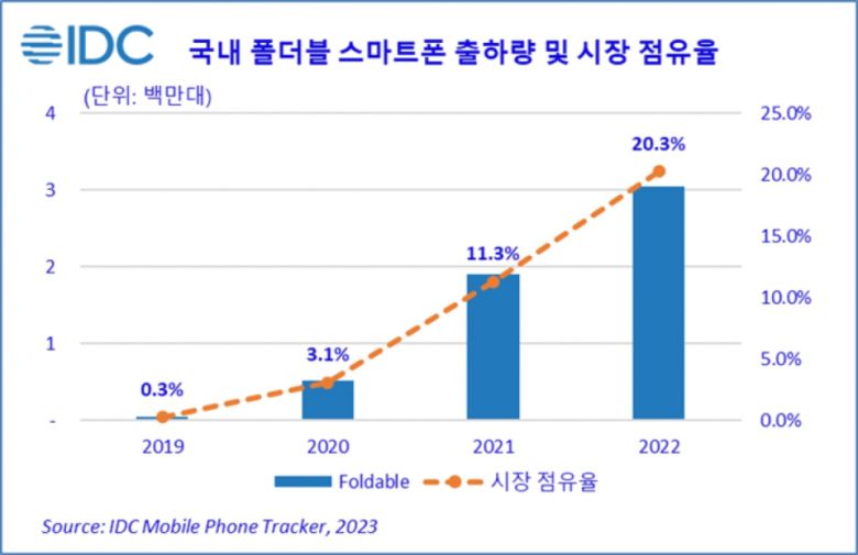 또한 2022년 하반기 국내 폴더블 스마트폰 시장 점유율은 전년 동기 대비 8.8%p 증가한 30.1%를 기록하며 큰 폭으로 성장했다. 특히 삼성전자의 폴더블 시리즈인 갤럭시Z 폴드 4 와 플립 4가 안정적인 제조 및 원활한 공급을 바탕으로 유니크한 디자인과 개인화된 경험을 선사하며 소비자 수요를 이끌어 낸 것으로 분석됐다. 이러한 시장 점유율 부문 약진은 국내 폴더블 시장이 틈새 시장에 불과하다는 기존 인식에서 탈피하는데 기여한 것으로 나타났다.