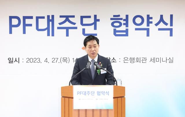 27일 서울 중구 은행회관에서 열린 PF대주단 협약식에서 김주현 금융위원장이 축사를 하고 있다. 연합뉴스 |