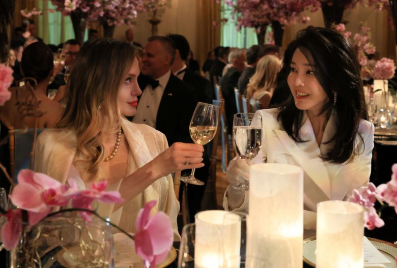 미국을 국빈 방문한 윤석열 대통령의 부인 김건희 여사가 26일(현지시간) 워싱턴DC 백악관에서 열린 국빈만찬에서 헐리우드 스타 안젤리나 졸리와 건배하고 있다. [공동취재]