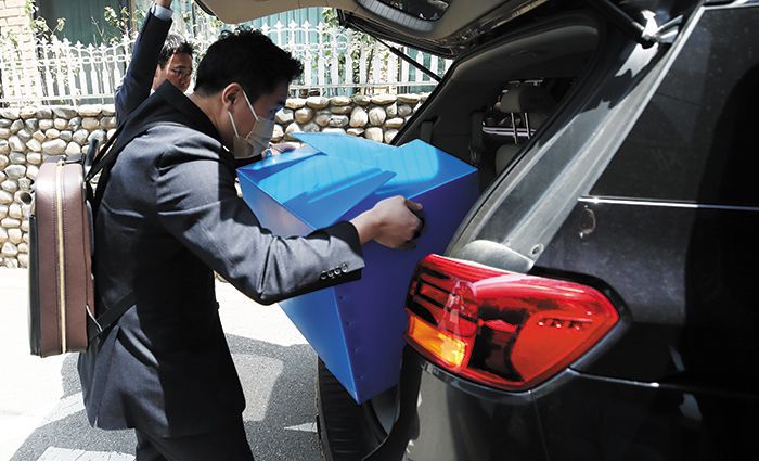 금융 당국 관계자들이 27일 오전 서울 강남구의 ‘SG증권 사태’ 관련 사무실을 압수 수색한 뒤 관련 압수품을 차량에 싣고 있다. 주가 조작 세력은 당국이 조사에 돌입하자 급히 특정 회사의 주식을 처분했고, 이들 종목의 시가 총액은 나흘 만에 8조원 이상 감소했다. /뉴스1 |