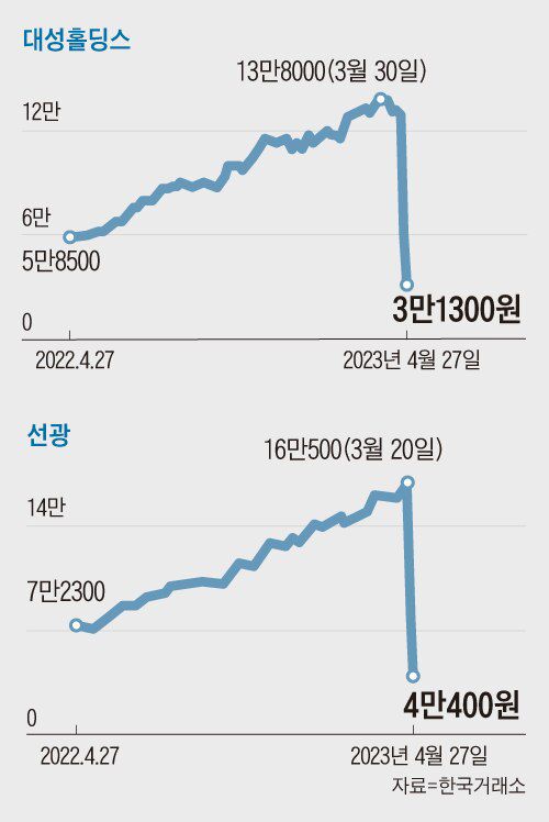 이 종목들은 대부분 작년부터 꾸준히 주가가 올랐다. 나흘 연속 하한가를 기록한 서울가스의 주가는 작년 4월 20일 18만3500원에서 지난 21일 46만7500원으로 1년 새 155% 올랐다. 같은 기간 삼천리는 358%, 대성홀딩스는 124%, 선광은 136% 상승했다. 그러나 서울가스는 4연속 하한가를 맞으며 27일 주가가 11만2700원으로 1년 전보다 오히려 39%가량 하락한 상태다.