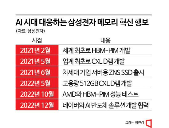 차세대 메모리 반도체는 인공지능(AI) 시대를 앞당길 핵심 열쇠다. 메모리 업계 1위 삼성전자는 이에 대응하기 위해 연산 기능을 품은 메모리 제품을 선보이는 등 기술 혁신에 힘쓰고 있다. 기존에 있던 기술 문법 대신 새로운 아이디어로 AI 수요에 대응하며 메모리 새 시대를 연다는 계획이다.