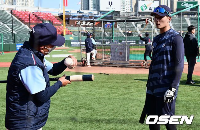 롯데 자이언츠 김평호 코치가 윤동희에게 번트에 대해 조언하고 있다. 2023.04.28 / foto0307@osen.co.kr