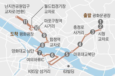 하프마라톤(21.0975㎞)과 10㎞ 부문 참가자 1만2739명이 30일 오전 8시 광화문광장에서 함께 출발한다. 10㎞ 부문은 여의도공원까지, 하프마라톤은 상암 월드컵공원 평화광장까지 달린다. 출발지에서는 타악기 공연이 열려, 4년 만에 돌아오는 서울하프마라톤의 개막을 축하한다. 어쿠스틱 밴드, 댄스, 풍물 등 다채로운 길거리 공연이 코스 곳곳에서 펼쳐져 참가자들 활기를 북돋아 줄 예정이다. 하프마라톤 참가자들이 통과하는 서강대교 주차장 인근 터널에는 디제이가 진행하는 조명 쇼도 준비했다.