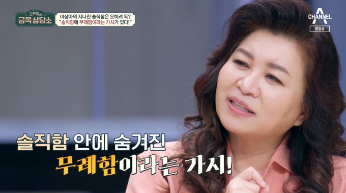 이를 들은 오은영 박사는 "이상아 씨가 주인공인 이 자리에서는 그렇게 이야기해도 된다. 하지만 '애로부부'는 사연자가 주인공이다. 나의 경험을 토대로 상대의 입장에서 공감하는 조언을 해야 한다. 다른 사람이 주인공일 때는 나로 귀결되면 안 된다"고 조언했다.