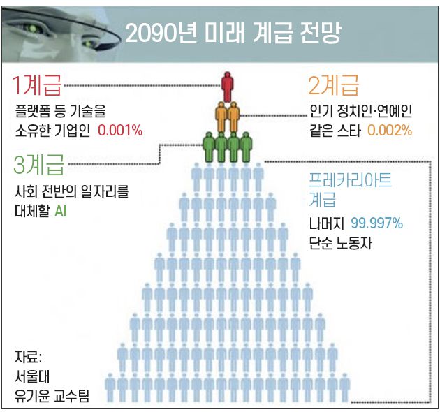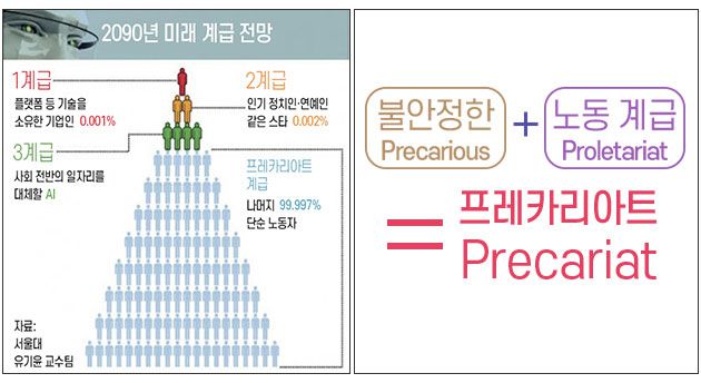 여기에서 플랫폼 소유주에 대해서 설명을 드리려면 '플랫폼'이 무엇인지를 말씀드려야 하는데, 그것은 일종의 진화 중인 정보 시스템이라고 정의를 할 수 있겠습니다. 그 정보 시스템을 소유한 사람들, 그러니까 투자자 혹은 개발자 같은 사람들입니다. 그렇다면 플랫폼 스타는 뭐냐, 그 플랫폼 속에서 활동하면서 수많은 팔로워를 거느리고 있는 영향력 있는 사람들입니다. 스타죠. 그 다음이 사회 전반의 일자리를 대체하게 될 AI, 인공지능이고요. 그리고 프레카리아트입니다. '프레카리아트'는 플랫폼의 소유권도 없고 스타도 아닌 일반 사람들입니다. (미래 사회계급에서) 전문직이냐 아니냐 이런 것은 전혀 관계가 없어요. 플랫폼을 소유했느냐, 또는 거기에서 자기가 스타 플레이어로 뛰느냐에 따라서 구분이 되는 것이죠. 사실상 대부분의 사람들이 '프레카리아트'라고 보시면 됩니다.
