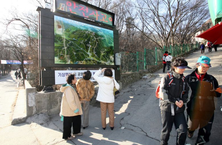 충남 공주시 계룡산을 찾은 등산객들이 동학사 매표소 길(왼쪽)이 아닌 무료 등산길(오른쪽)로 산을 오르 내리는 모습. 강창광 기자. |