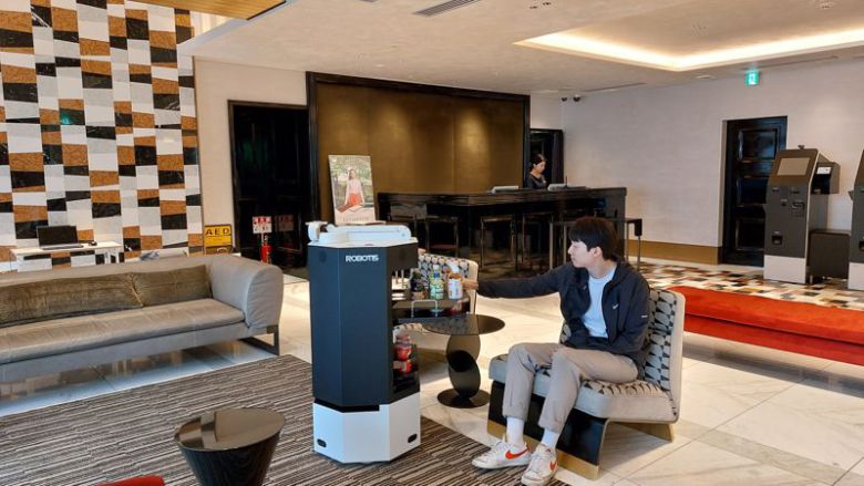 ㈜로보티즈의 자율주행 로봇 '집개미'가 일본 '더 라이즈 오사카 기타신치' 호텔 로비에서 고객에게 웰컴 드링크를 서빙하고 있다. 로보티즈 제공