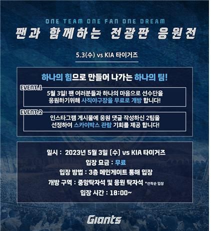 또 이날 전광판 응원전과 관련한 인스타그램 게시물에 응원 댓글 작성한 2팀(팀 당 최대 10명 관람 가능)에게는 스카이박스에서 관람할 수 있는 기회를 제공한다.