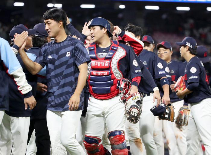 2일 광주기아챔피언스필드에서 열린 프로야구 롯데 자이언츠와 KIA 타이거즈의 경기에서 7-4로 승리한 롯데 선수들이 코치진과 하이파이브 하고 있다. 연합뉴스. |